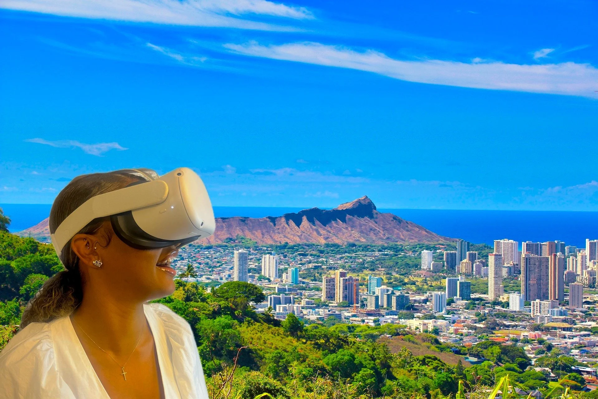 A woman with earrings and a cross necklace wearing a virtual reality headset, standing outdoors with a cityscape, mountains, and the ocean in the background.